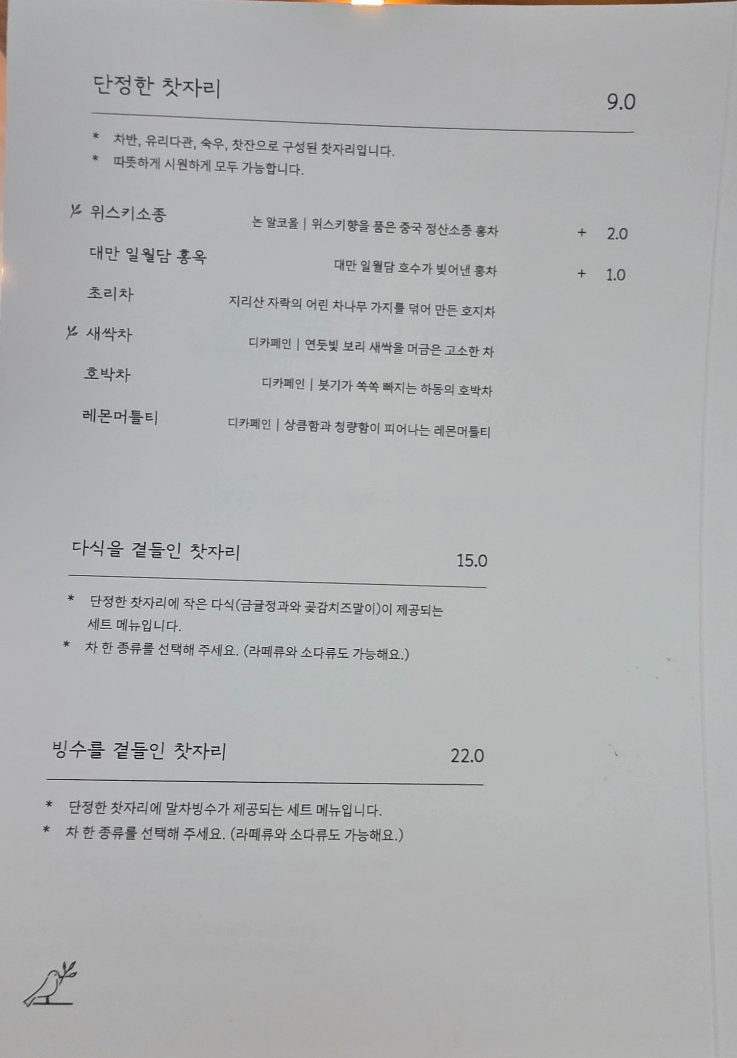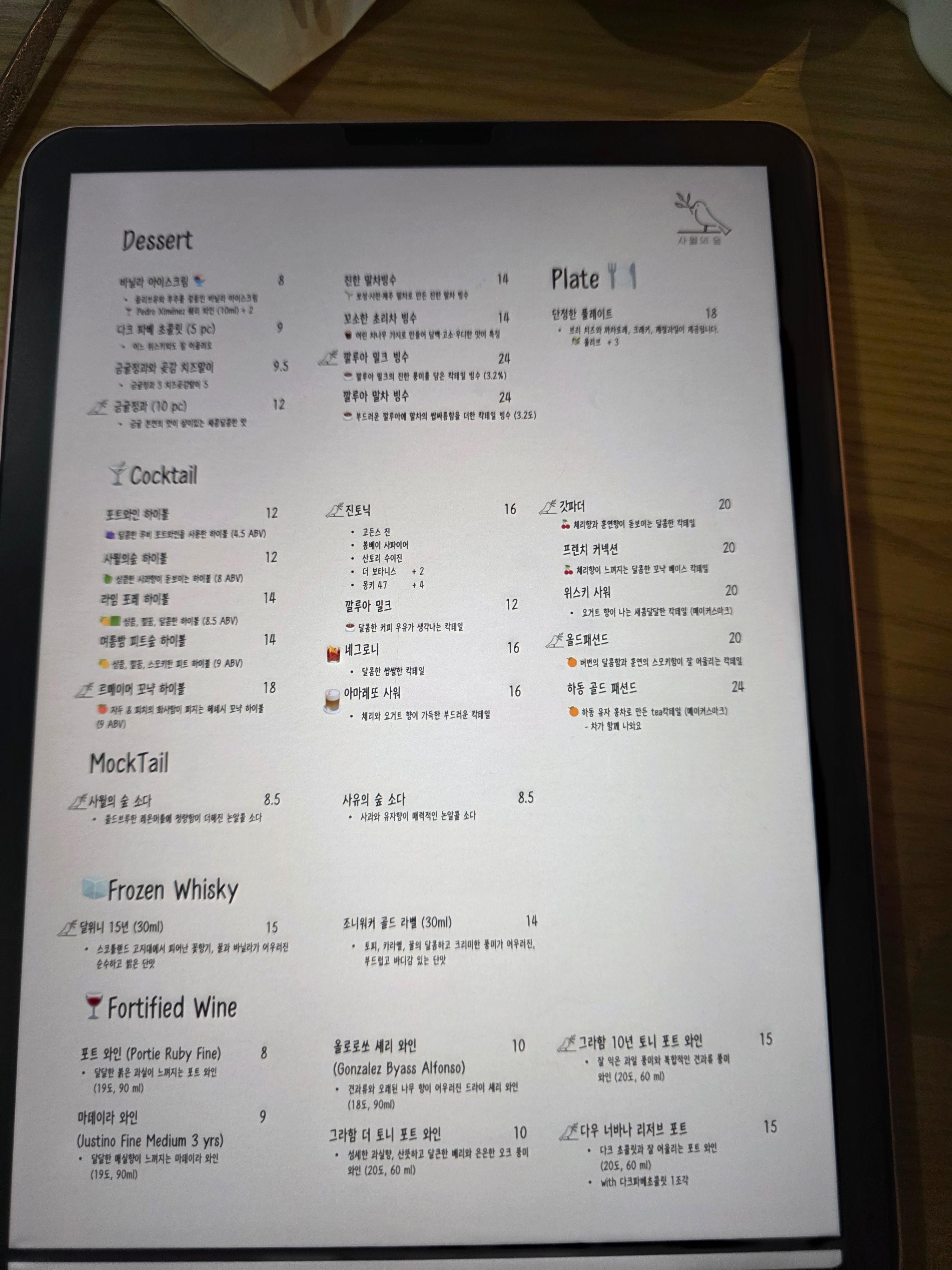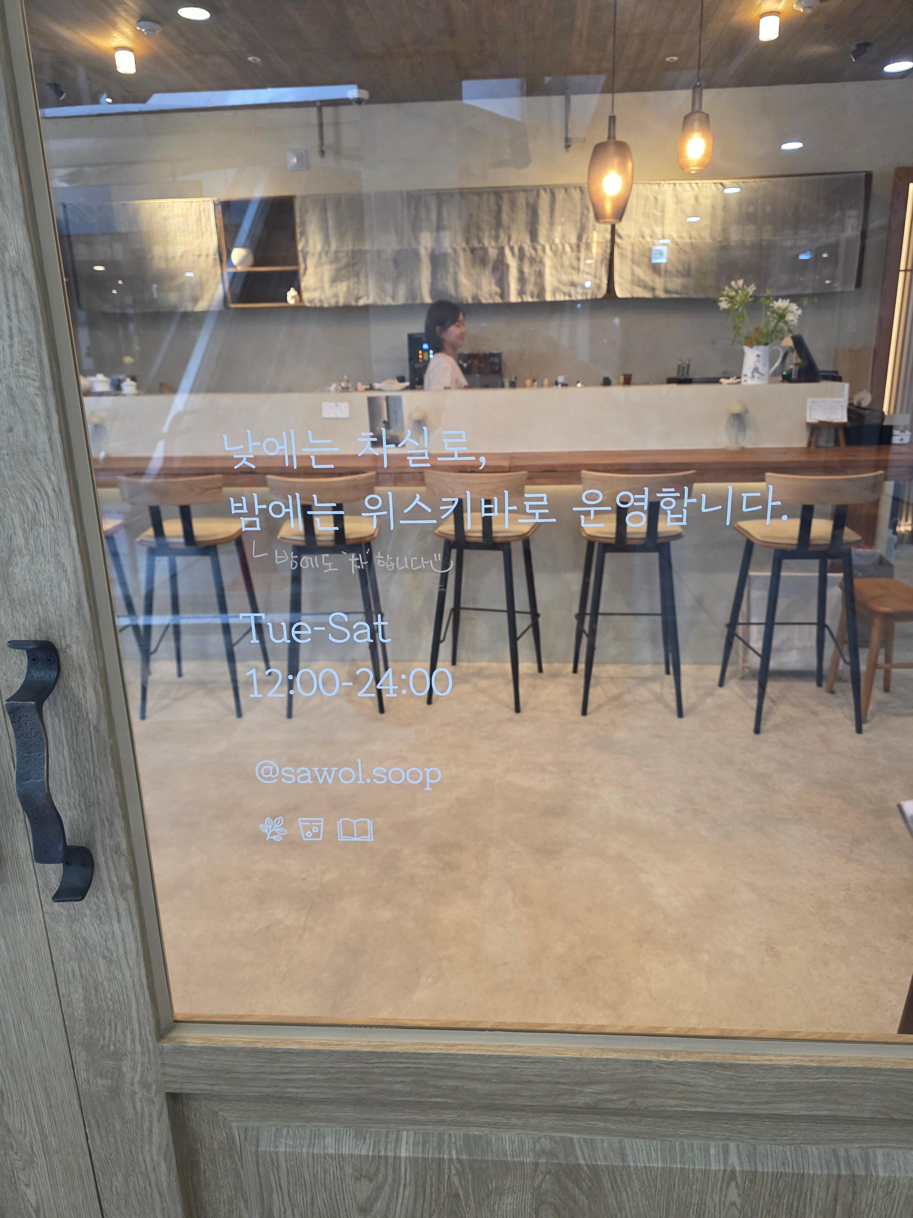 - 낮에는 국산 말차라떼, 홍옥라떼, 말차빙수, 전통 다식 같은 디저트를 중심으로 운영되고
