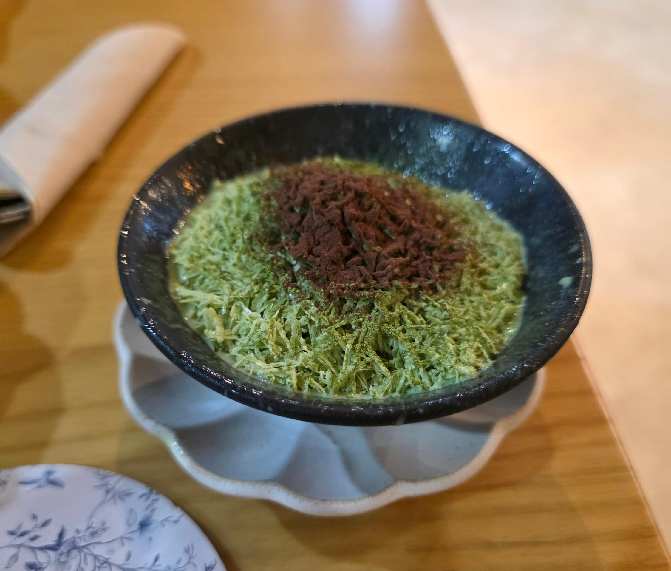 얼음이 곱고 부드러워 입안에서 사르르 녹아요. 진한 말차 풍미 덕분에 달지 않고 깔끔해서 부담 없이 즐길 수 있었습니다.
