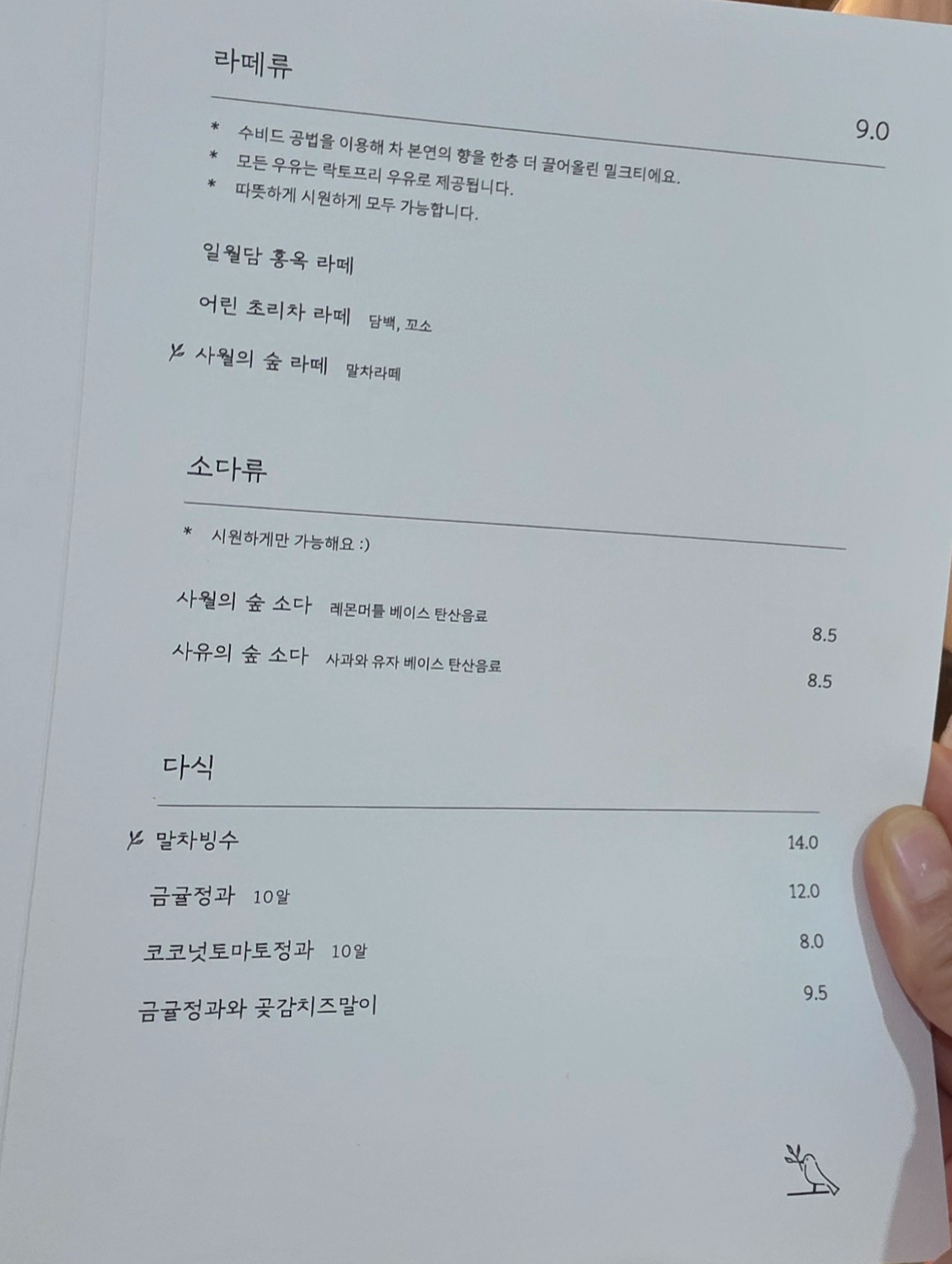 사월의 숲은 일반 카페와 달리 커피 메뉴는 거의 없고, 차·라떼·디저트·칵테일이 중심이에요.