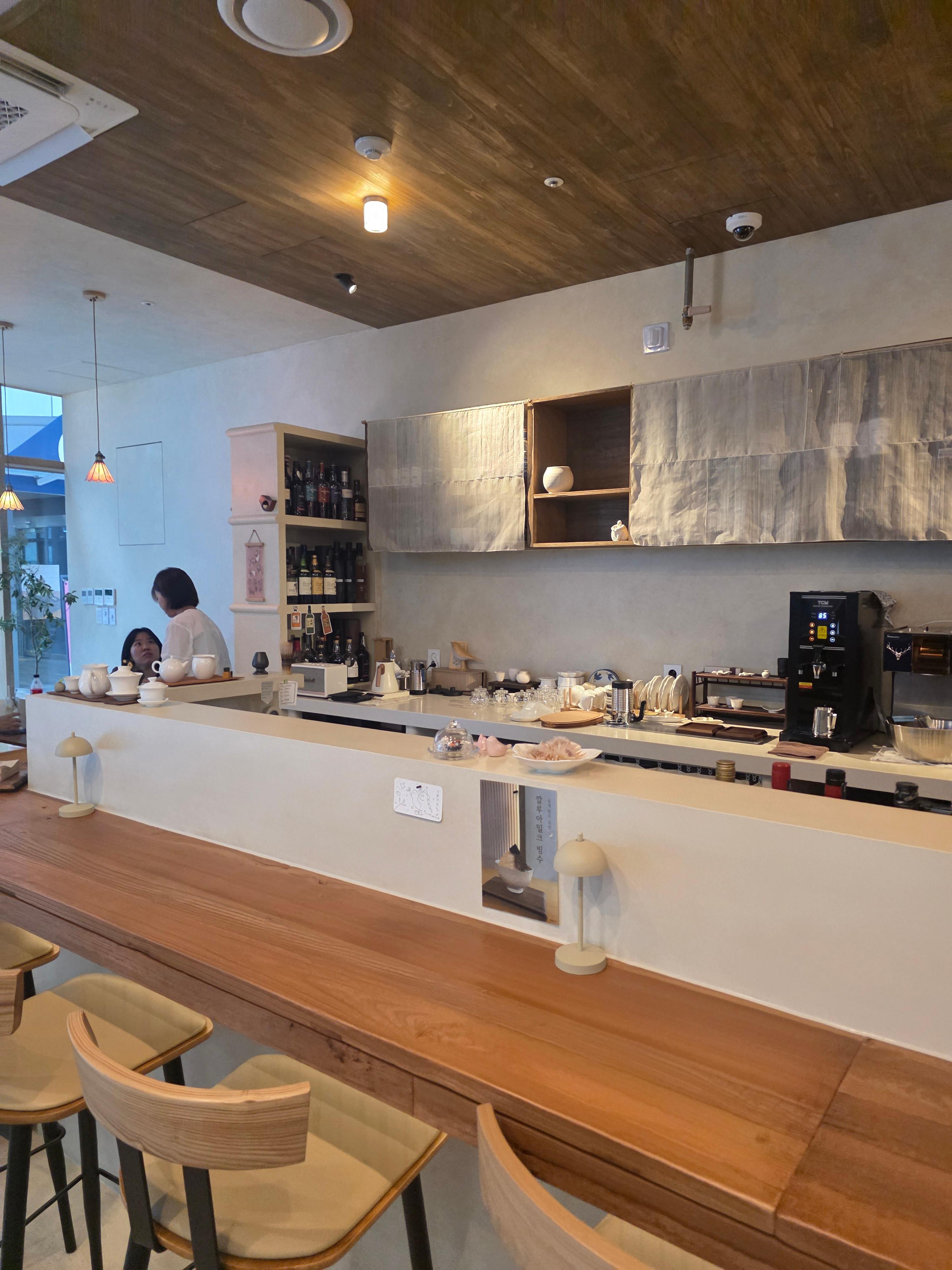 처음 들어서자마자 느껴진 건 우드톤 인테리어와 따뜻한 조명이 주는 포근함이었어요. 낮에는 아늑한 티하우스 느낌이 강하고, 저녁 시간이 되면 은은한 조명이 켜지면서 분위기가 한층 차분하고 세련된 바로 바뀝니다.
