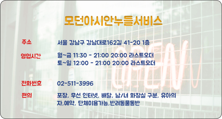 - 상호명: 모던아시안누들서비스 (Modern Asian Noodle Service)