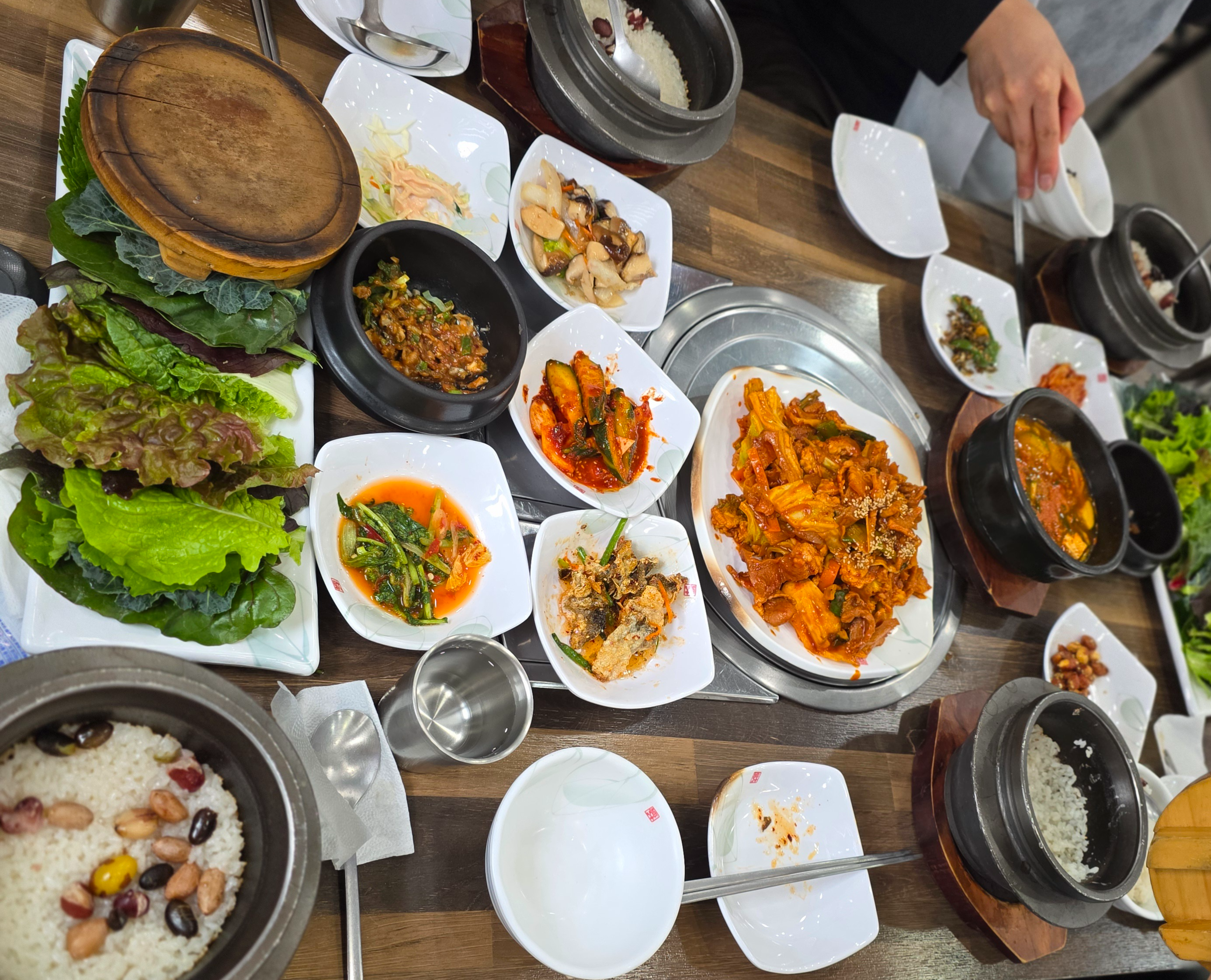 테이블 위로 돌솥밥, 된장찌개, 쌈채소, 그리고 8가지 반찬이 정갈하게 등장했어요. 보기만 해도 정성이 느껴지는 상차림이었어요.