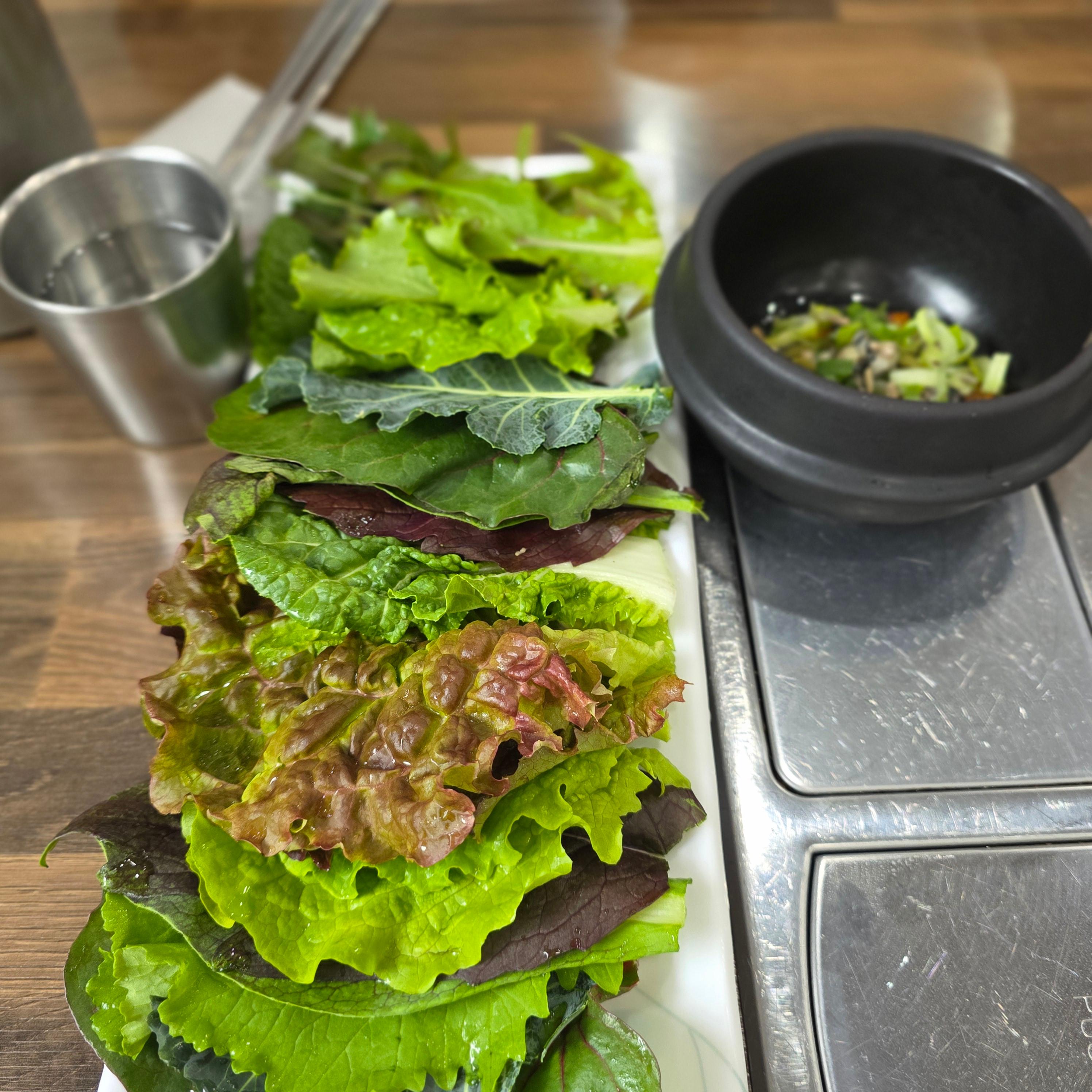 쌈 채소는 상추, 깻잎, 배추잎, 적채, 치커리 등 10가지 이상으로 구성돼요. 모두 싱싱하고 신선해서 정말 만족스러웠어요.