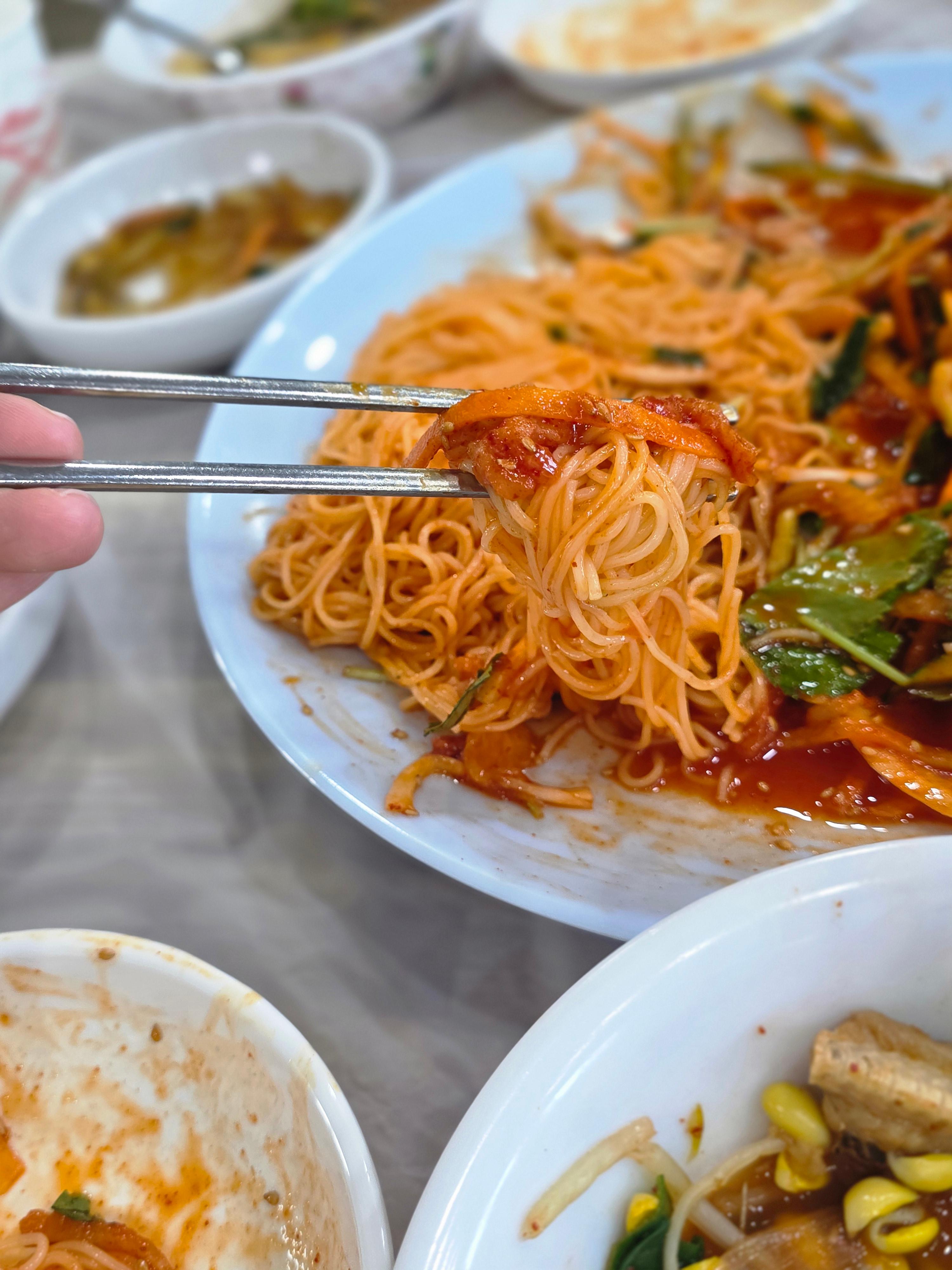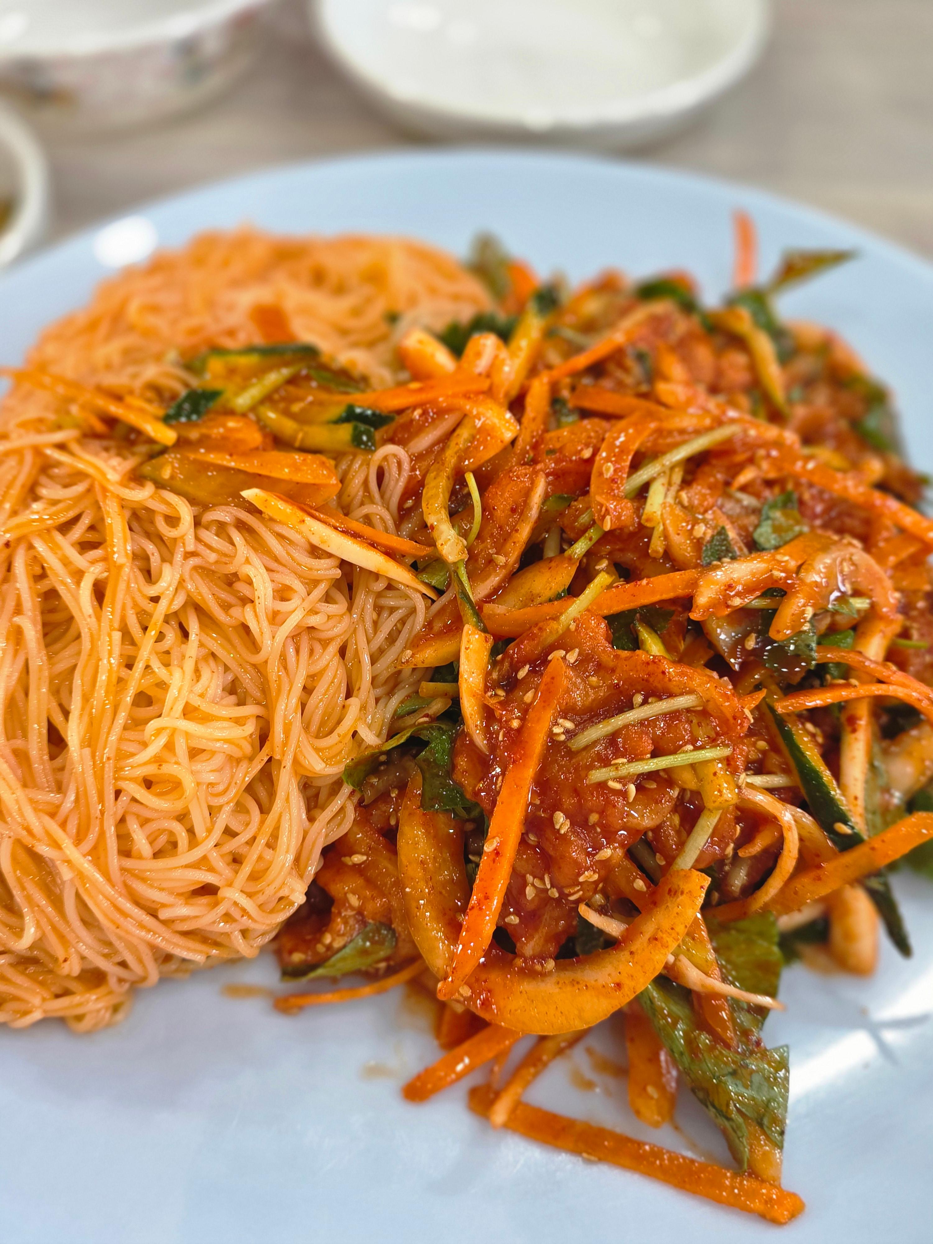 오독오독한 간재미에 매콤새콤한 양념, 아삭아삭 야채, 그리고 중면이 촤악— 감긴 조합.