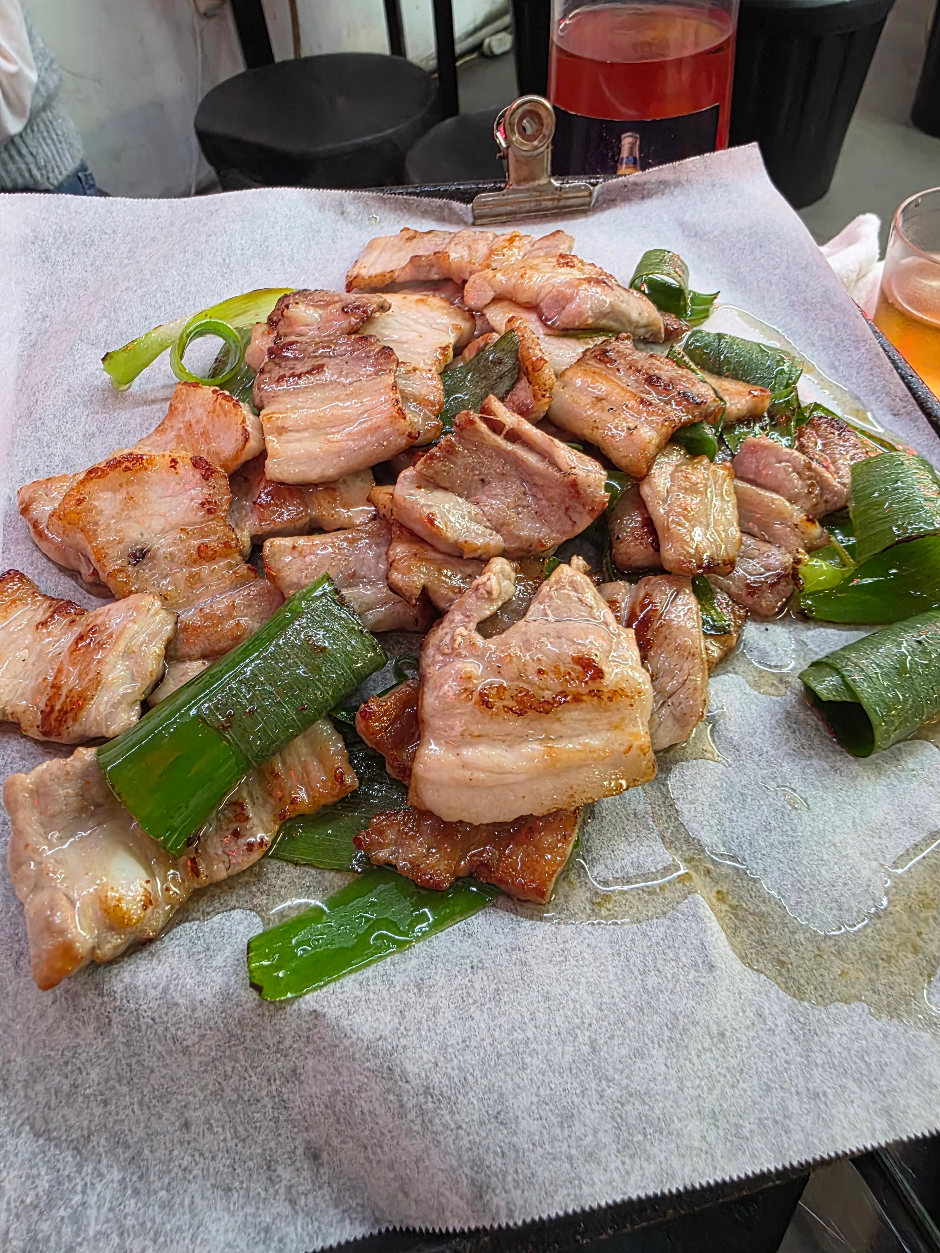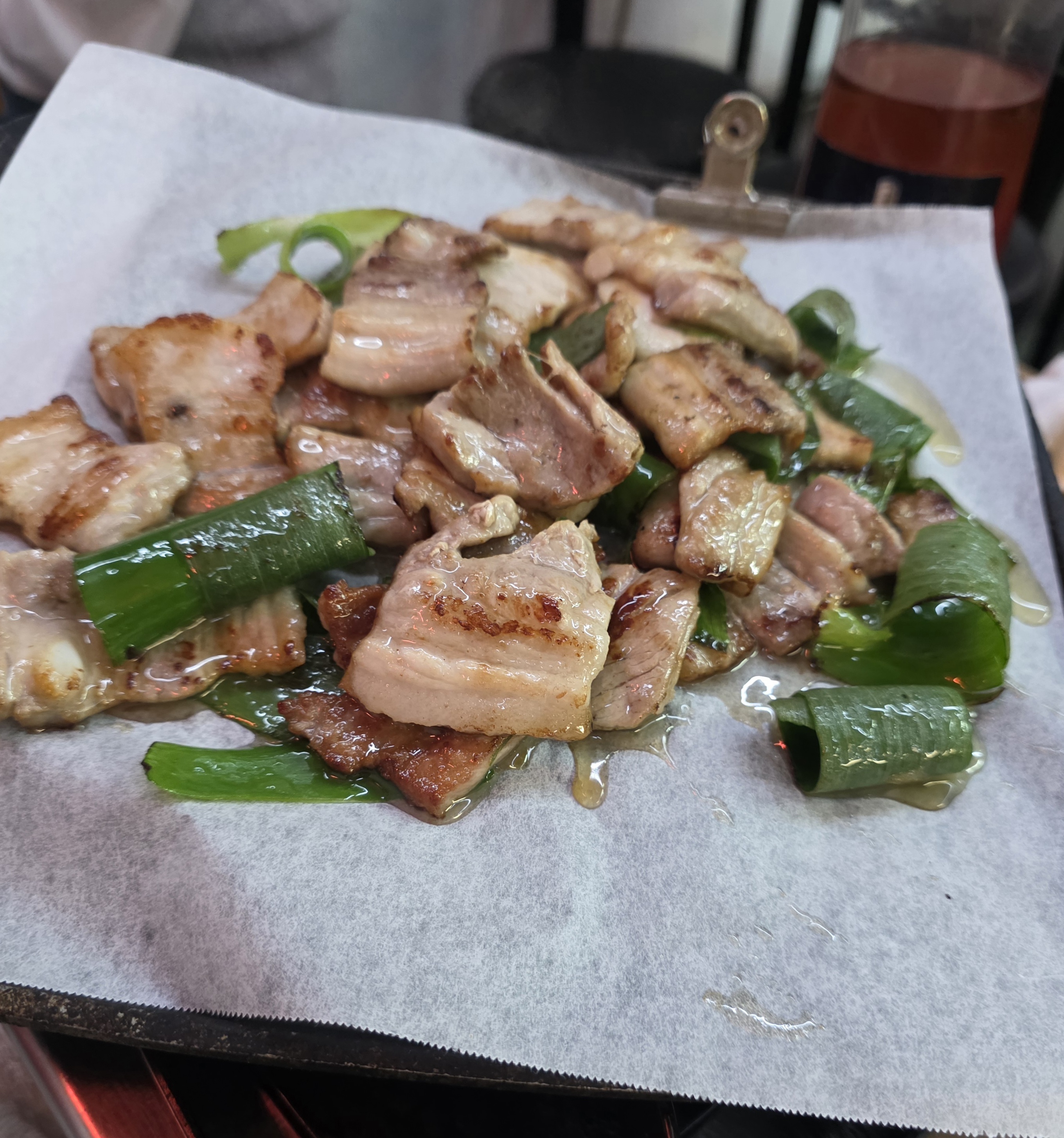 불판 위에 기름 촉촉한 종이 깔려 있고 노릇노릇 구워진 삼겹살과 파가 함께 나옵니다.