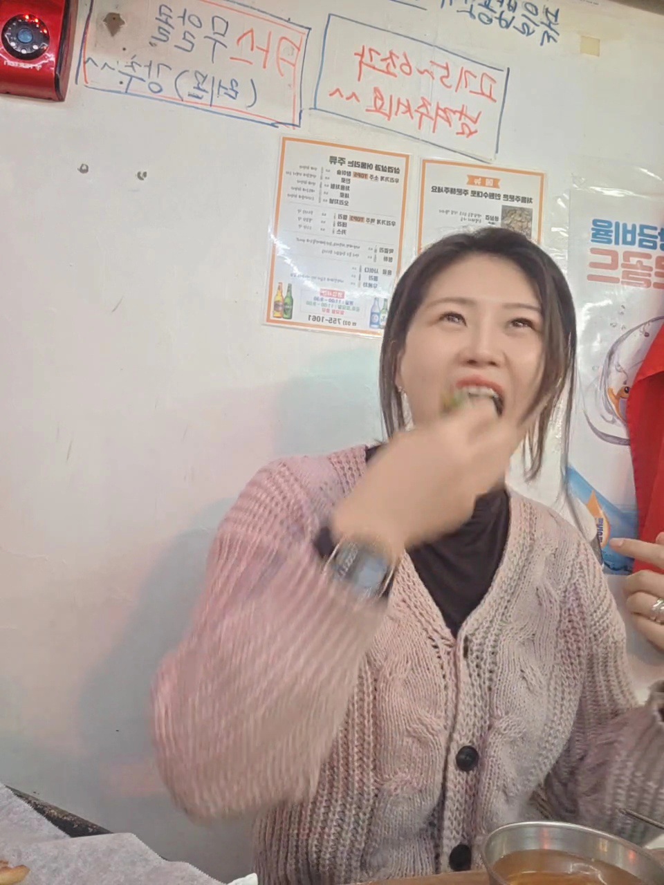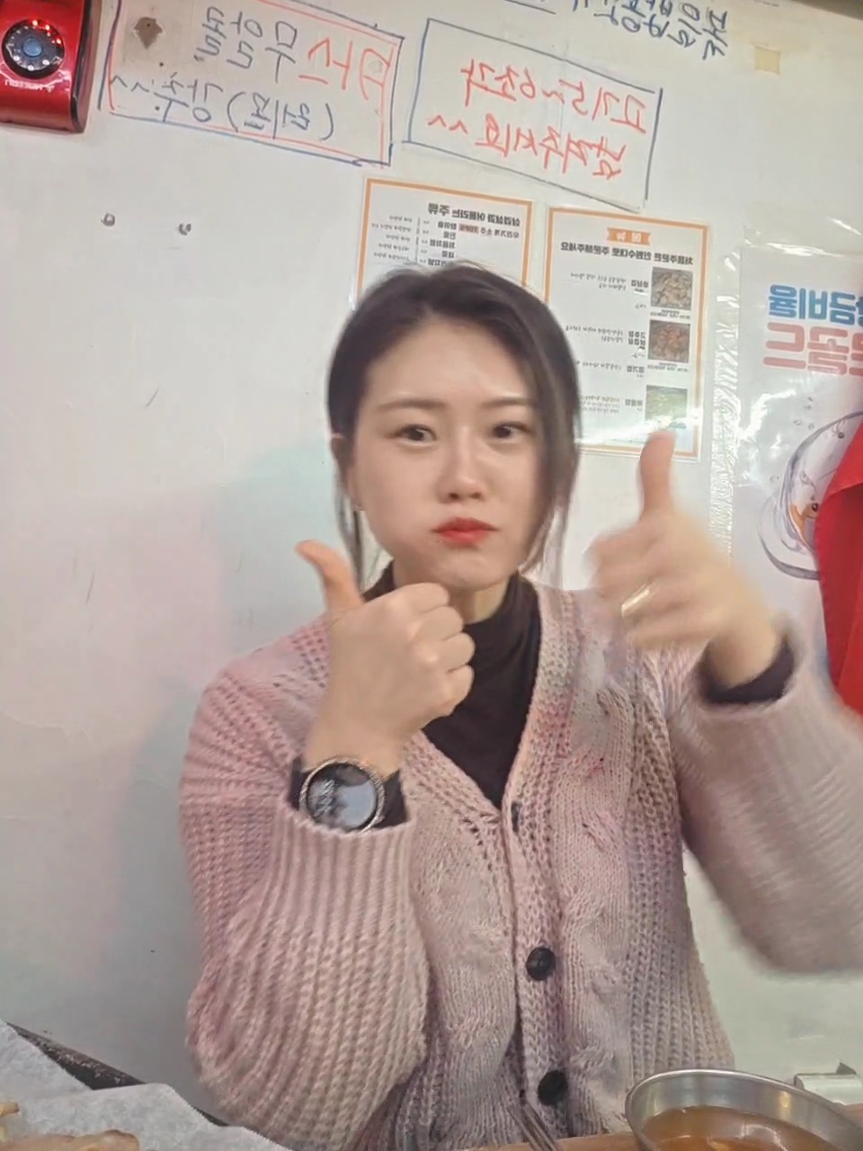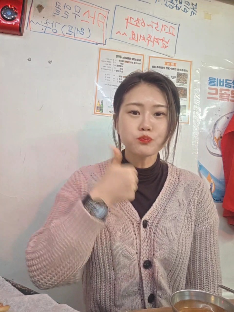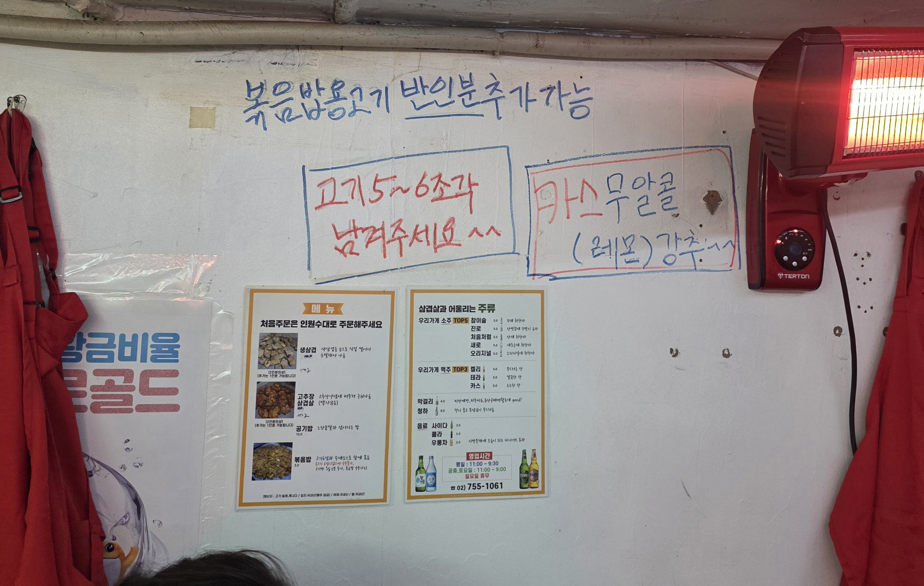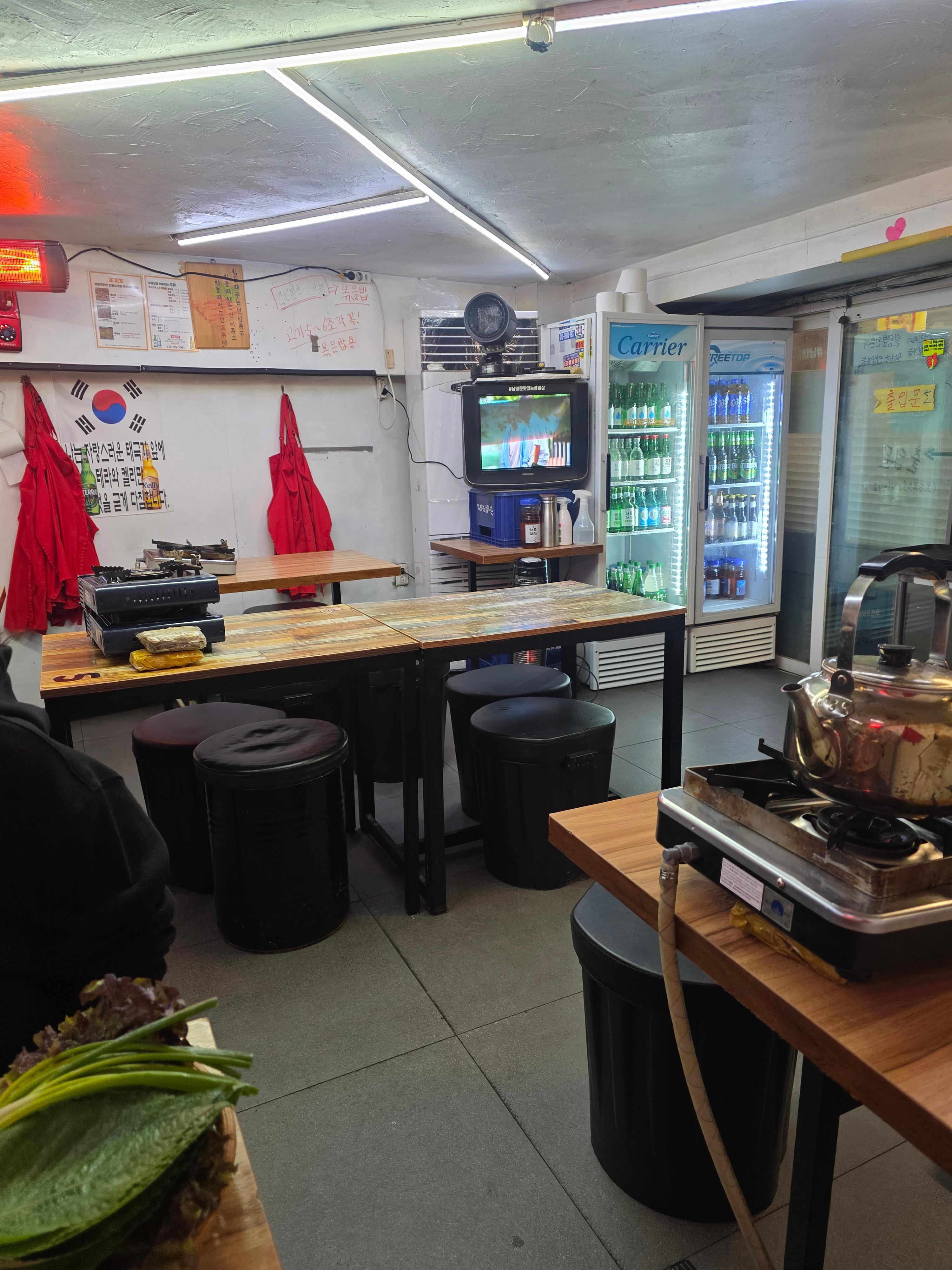 벽에 걸린 앞치마, 그리고 레트로 TV까지 딱 켜져 있고 뭔가 시간이 멈춘 작은 포차 느낌이에요.