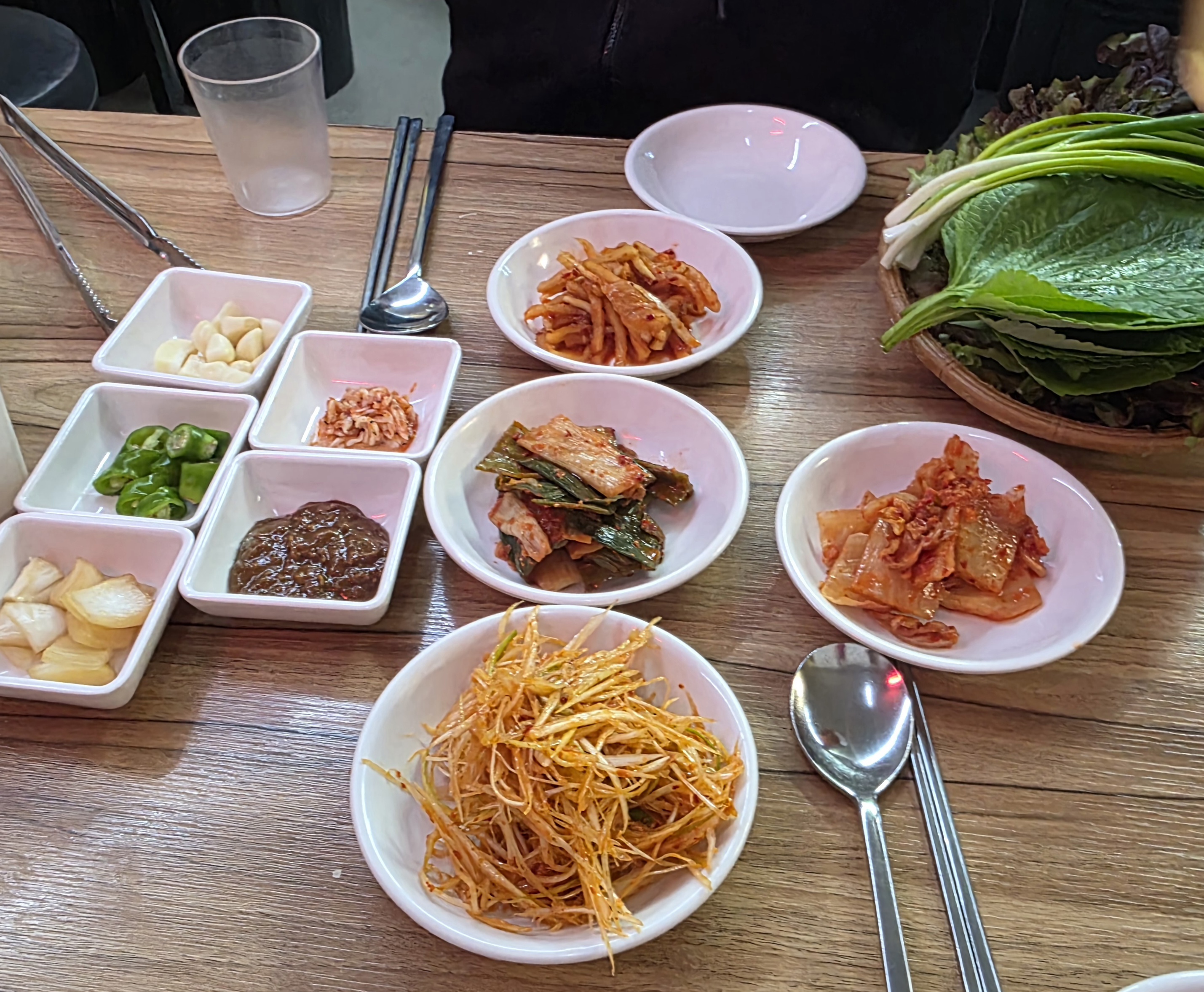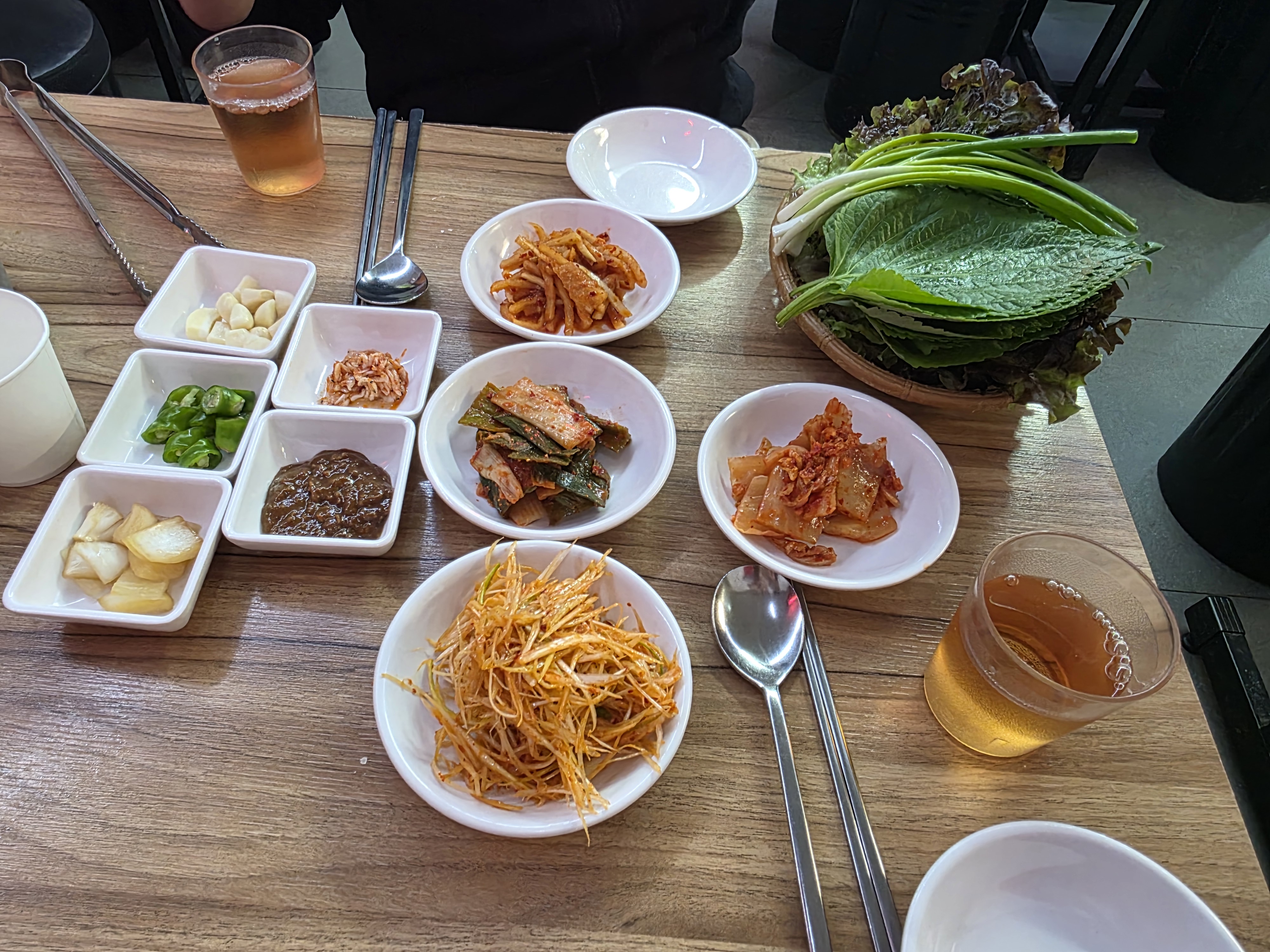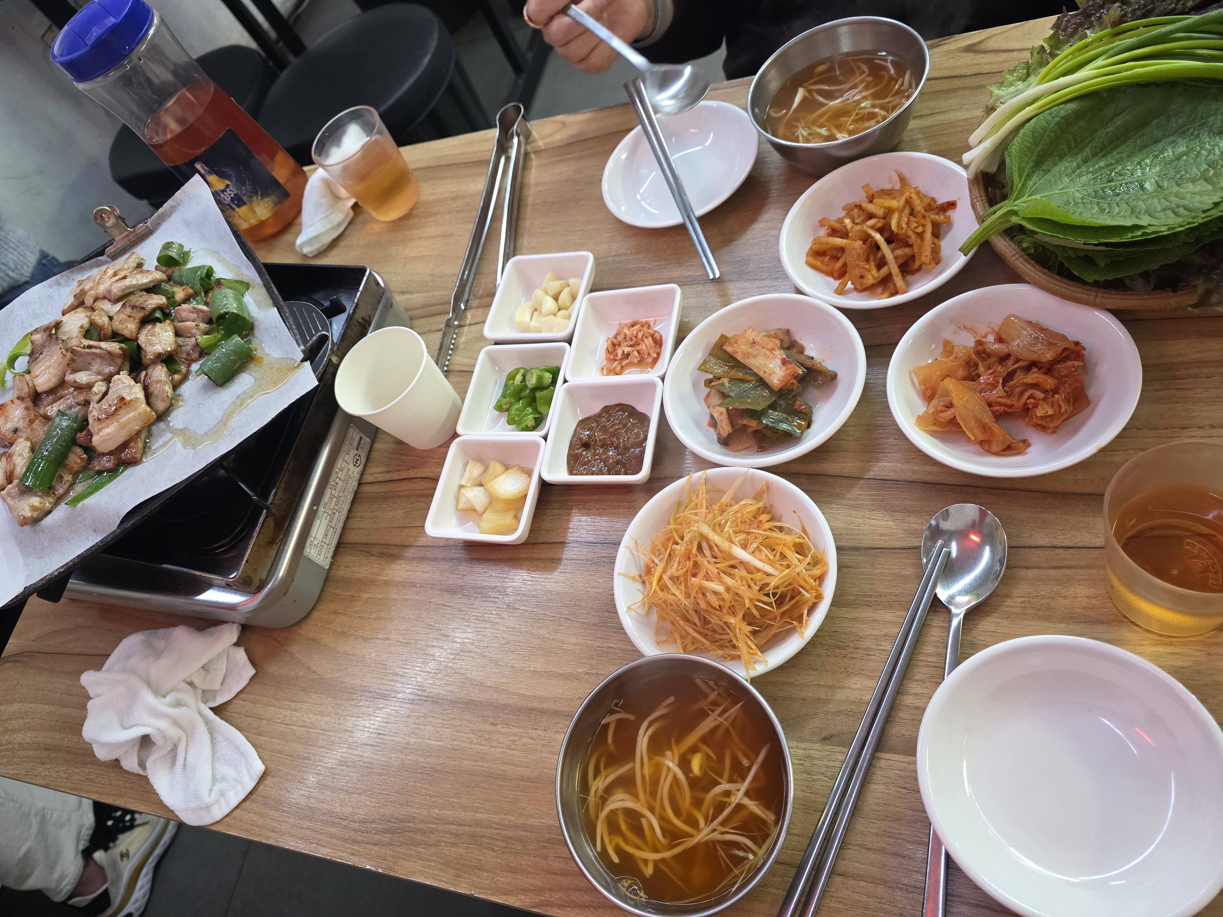 그리고 상추와 깻잎이 넉넉하게 제공돼요. 쌈 좋아하는 사람한테는 진짜 천국! 한 입 크게 싸먹는 재미가 있어요.