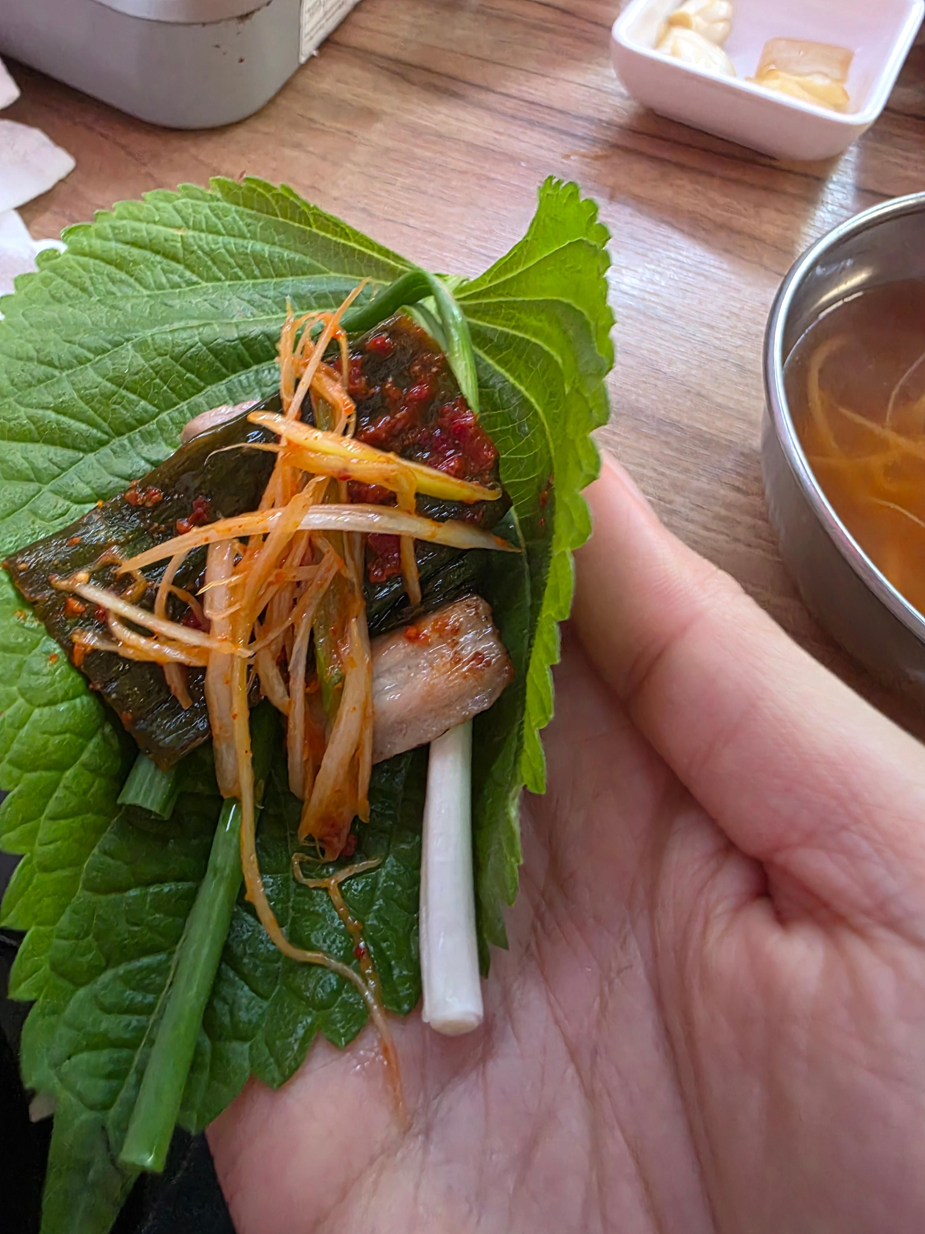 파랑 같이 구워서 향이 업그레이드되고, 깻잎 위에 올려서 먹으면 완성.