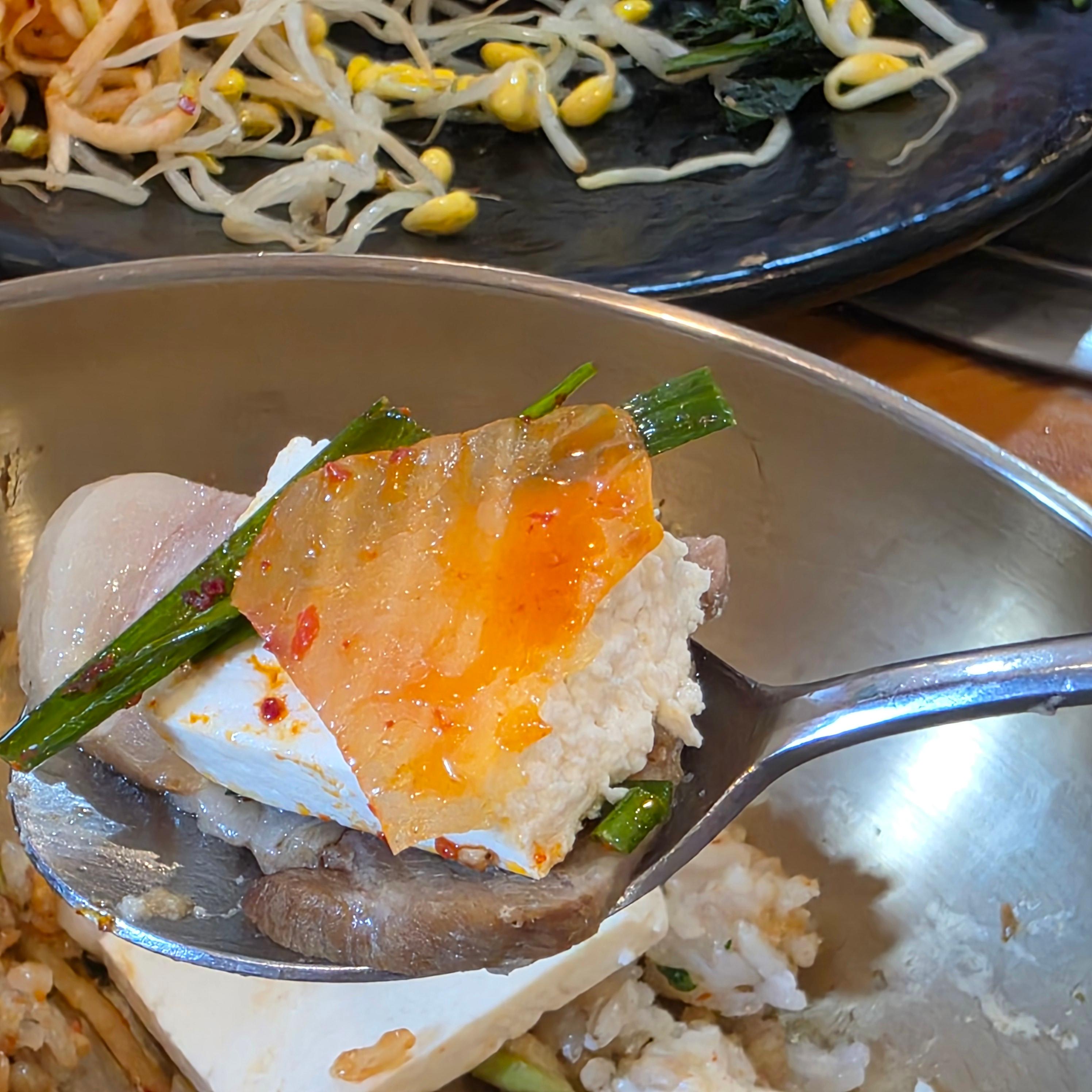 수육 먹고 난 다음에 이 순두부 한 숟가락 딱 먹으면 다시 또 먹을 힘이 생겨요.