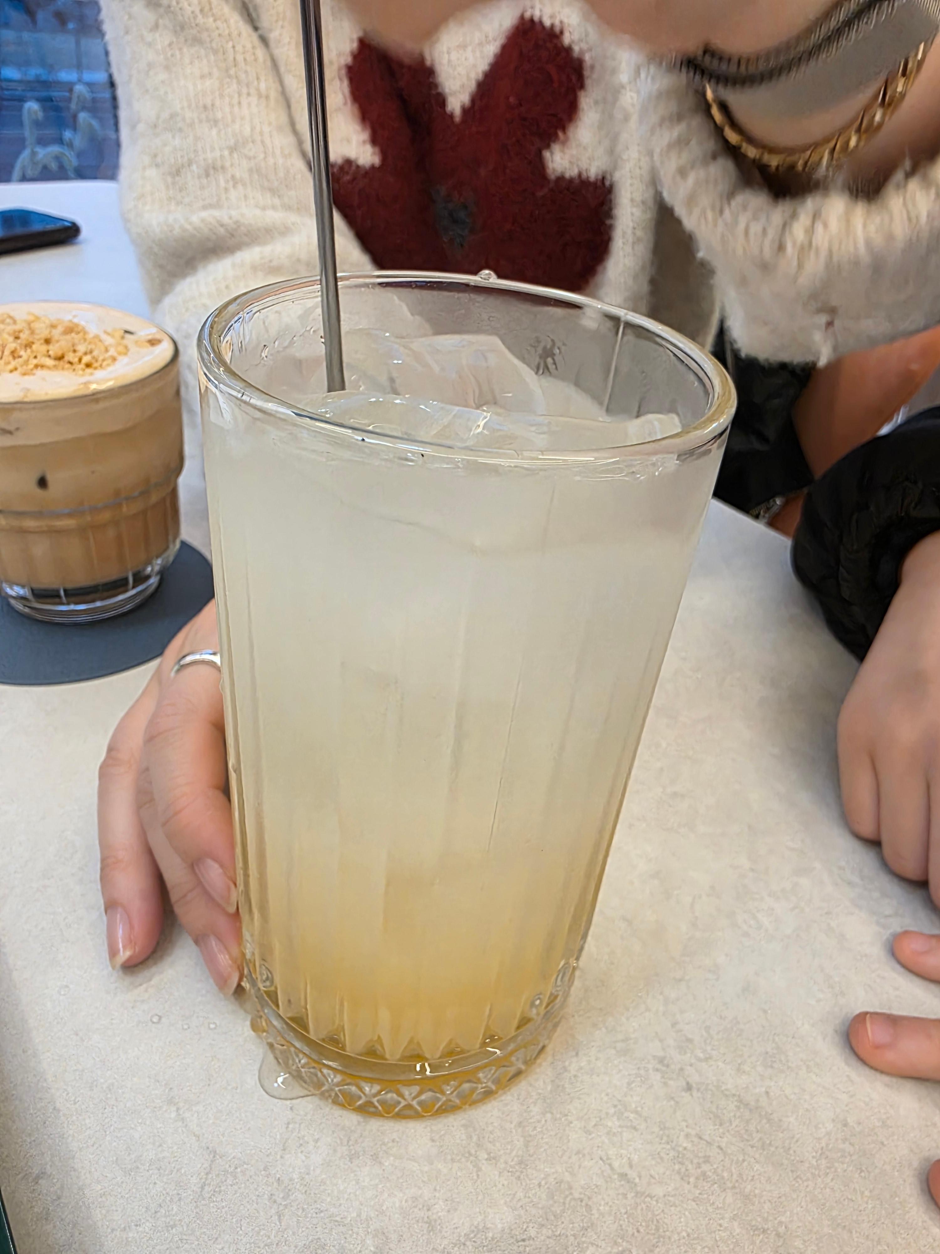 레몬에이드는 제가 평소에 마시던 설탕시럽 느낌이 아니라, 살짝 꿀이 들어간 것처럼 부드러운 단맛이 느껴졌어요. 단맛이 확 올라오는 게 아니라 은은하게 퍼지면서 뒤에 상큼함이 남아서 디저트와 함께 마시기 좋았습니다. 일반적인 레몬에이드와는 다른, 조금 더 부드러운 스타일이었어요.