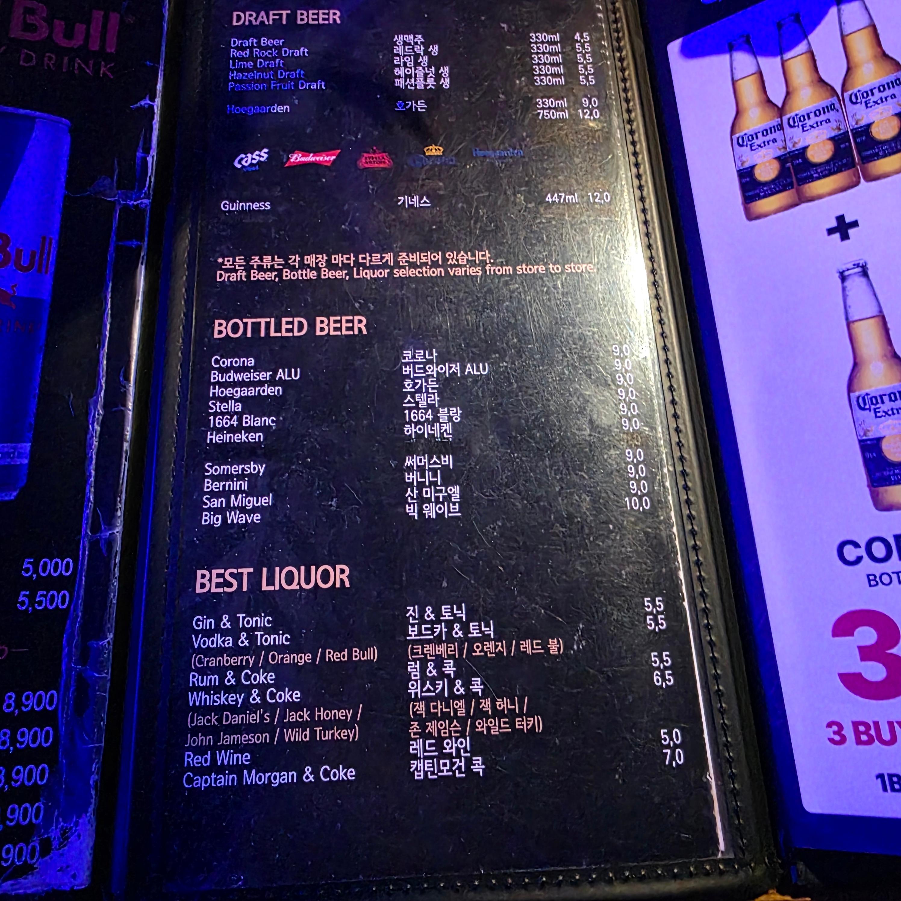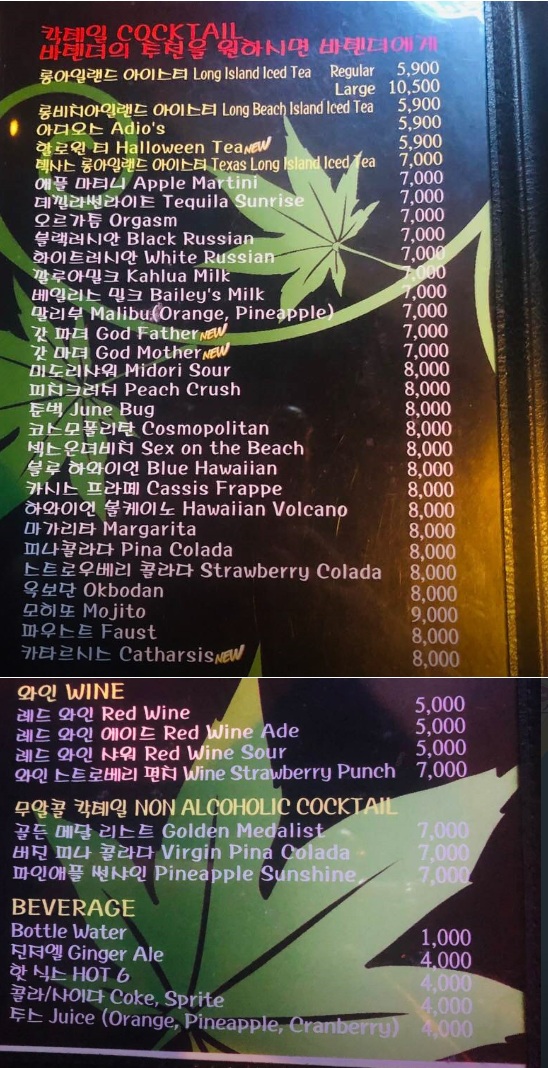 메뉴판에는 다양한 칵테일과 맥주가 적혀 있었고, 가격도 적당해서 부담 없이 즐길 수 있었답니다.