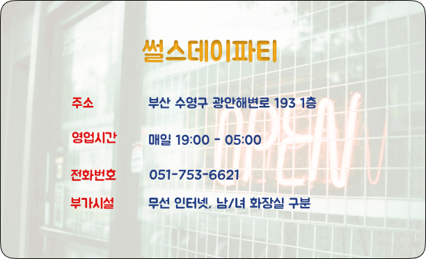 썰스데이파티는 광안리 해변 근처에 위치한 바이고, 이곳은 주로 젊은 층이 많이 찾는 곳으로, 분위기가 정말 힙해요.