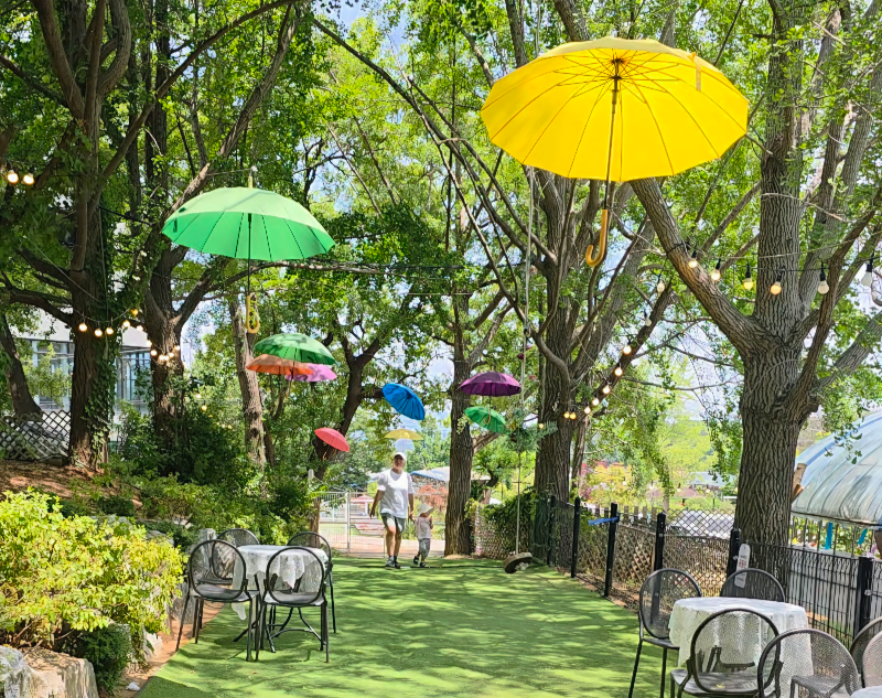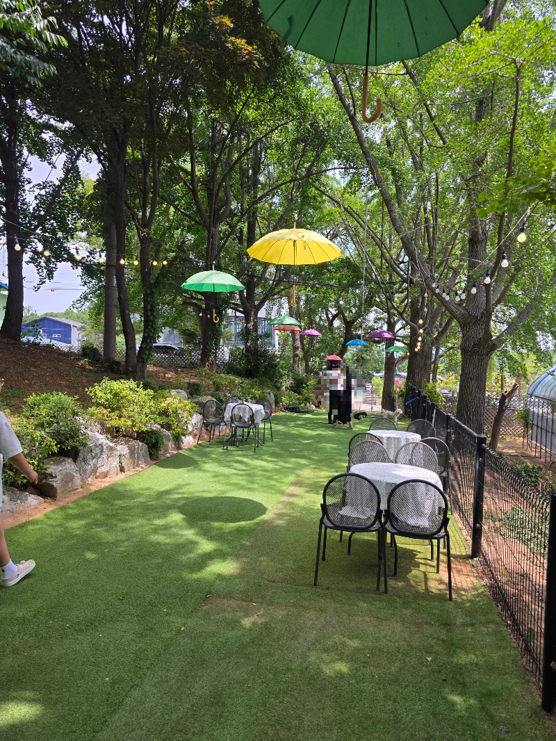 저희는 야외 테이블에서 시간을 보냈는데, 특히 위쪽 나무 숲 아래에 있는 테이블이 시원해서 조카가 노는 걸 보면서 편하게 쉴 수 있었어요.