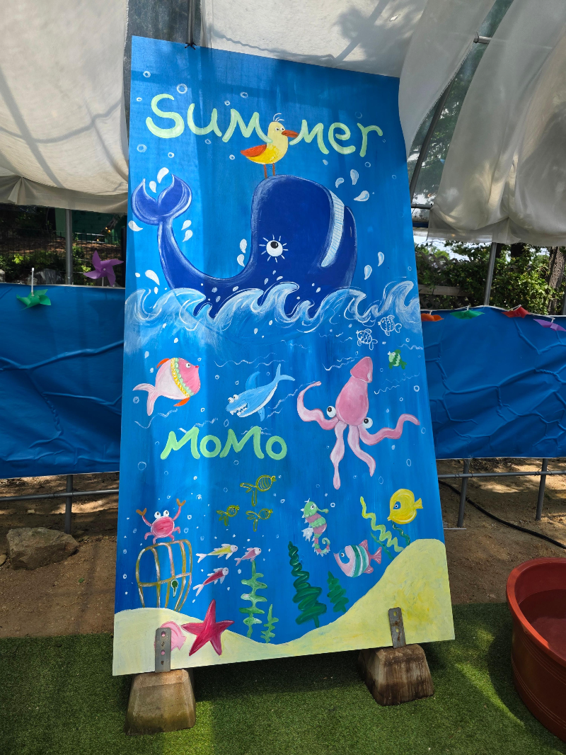 여기는 천가림막이 있는 모모물놀이존이예요 여기에 큰 대야 3개에 물이 받아져 있어서 간단하게 물놀이도 가능해요.
