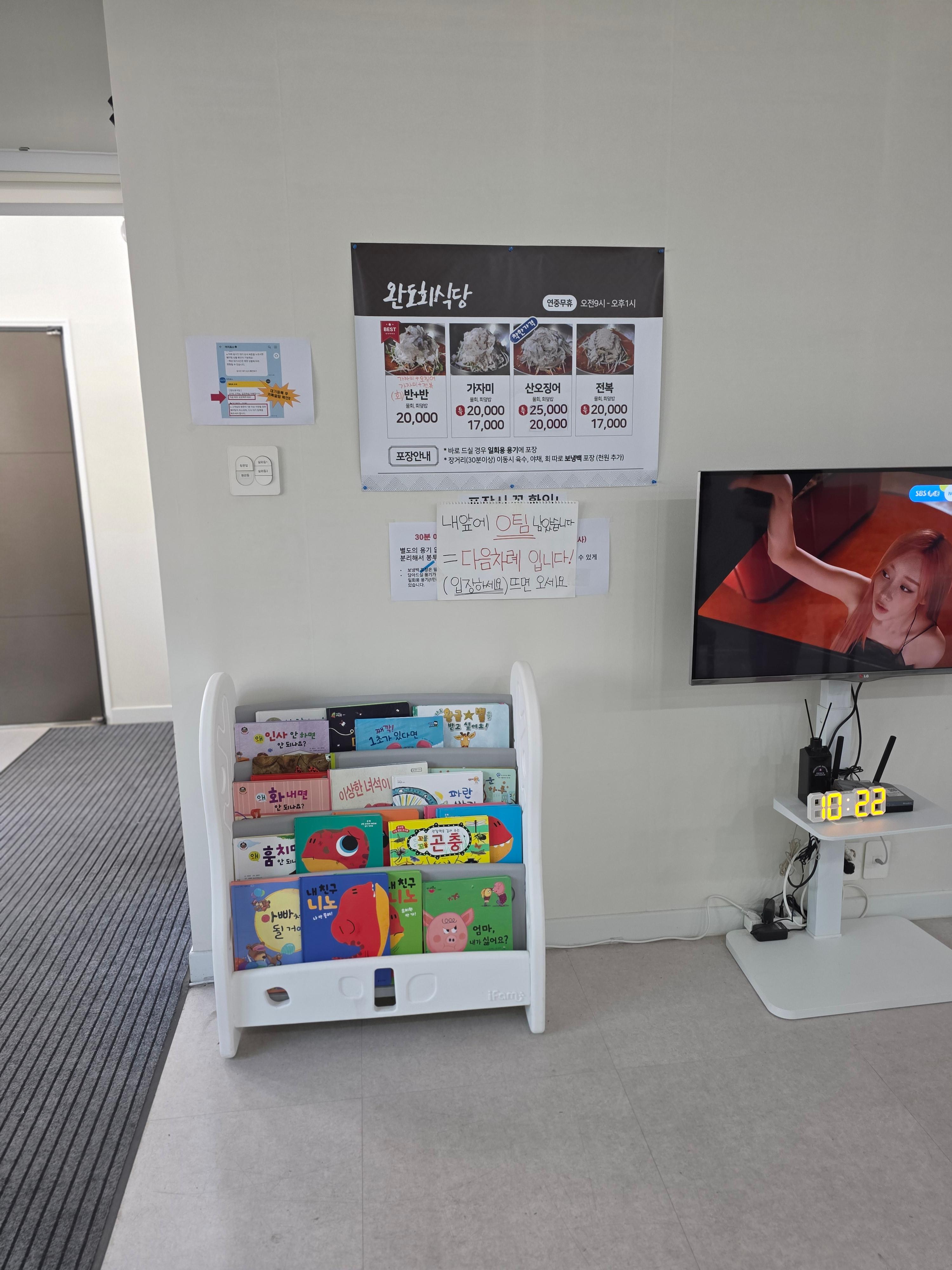 대기실은 매장 앞에 아예 장소가 마련되어 있어요. 들어가면 이렇게 아이들이 볼수있는 책들도 있고 티비도 있고 그리고 화장실도 잇어요. 대기장소 이렇게 쾌적한곳이 없는데 완전 좋더라구요. 생각보다 저희 엄청 빨리 불러서 깜놀!!