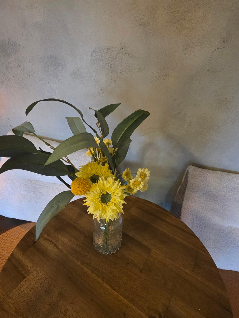 창문으로 보이는 바깥 풍경도 참 인상 깊었어요. 푸른 정원 사이사이로 저 멀리 보이던 샤스타데이지꽃들이 뭔가 묘한 여운을 남기더라구요. 꽃은 많이 지긴 했지만, 그 흔적만으로도 충분히 아름다웠어요. 그리고 실내에 흐르던 잔잔한 음악까지. ‘여기 진짜 제대로 쉬러 온 느낌이다’ 싶었답니다.