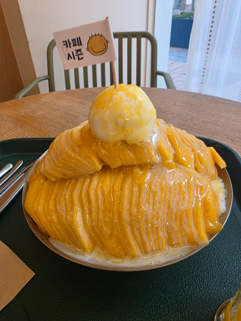 여수에서 시원하고 제대로 된 빙수를 찾는다면 시즌카페가 정답이에요. 신선한 과일이 그날그날 바로 올라가는 퀄리티가 진짜 마음에 들었고, 무엇보다 생망고빙수의 맛이 정말 찐! 와플도 수제라서 카페 퀄리티를 한층 더 높여주더라고요.