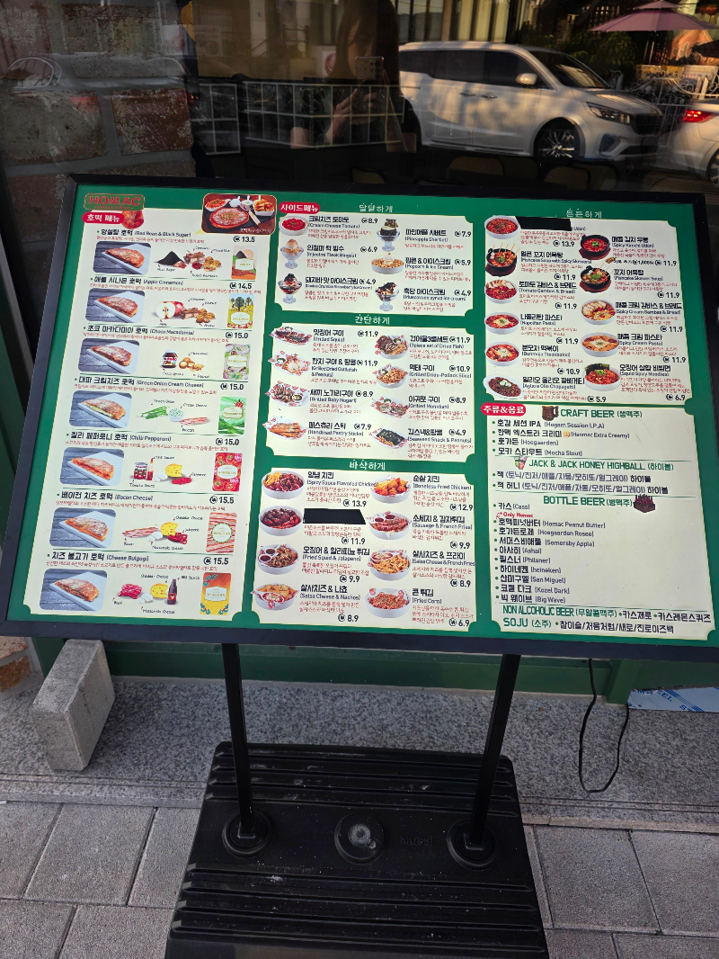 | 맥주류 | 생)카스 프레쉬 3,000원, (생)호가든 7,000원, (생)모카 스타우트 6,500원, (생)호감 세션 IPA 7,500원 카스/참이슬/처음처럼/진로/새로 각 5,000원, 스텔라 6,500원, 코젤다크 9,000원, 블랑 1664 8,000원, 새로 살구/다래 각 5,000원 |